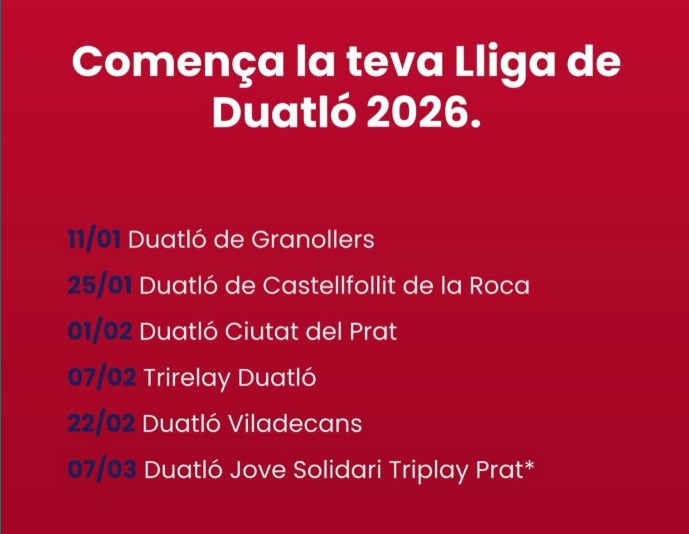IX TRIRELAY DUATLÓ - C.N.C. RELLEUS 07/02/2026 INFORMACIÓ I INSCRIPCIONS TRIRELAY DUATLÓ OPEN 07/02/2026 INFORMACIÓ I INSCRIPCIONS VIII TRIRELAY DUATLÓ JOVE 07/02/2026 INFORMACIÓ I INSCRIPCIONS IX TRIRELAY DUATLÓ-C.N.C. RELLEUS-RELACIÓ NOMINAL INSCRITS 07/02/2026 INFORMACIÓ I INSCRIPCIONS IX DUATLO DE VILADECANS 22/02/2026 INFORMACIÓ I INSCRIPCIONS VIII DUATLÓ JOVE SOLIDARI SJD TRIPLAY PRAT 07/03/2026 INFORMACIÓ I INSCRIPCIONS VIII DUATLÓ INFANTIL SOLIDARI SJD TRIPLAY PRAT-ANY 2015 AL 2022 07/03/2026 INFORMACIÓ I INSCRIPCIONS